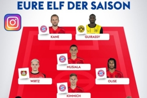 德天空对本赛季德甲最佳阵容进行了评选,其中6将来自拜仁,多特和勒沃库森各2席。具体如下: