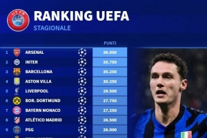 本赛季欧战积分排名:阿森纳居首,国米、巴萨、维拉、利物浦前五